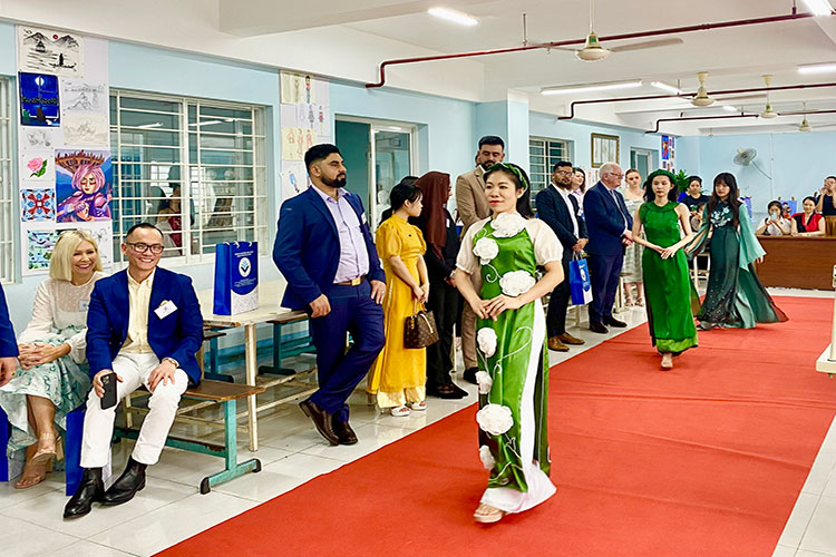 ThS. Nguyễn Ngọc Hiển – Hiệu trưởng nhà trường giới thiệu với đoàn Australia về Trung tâm thời trang