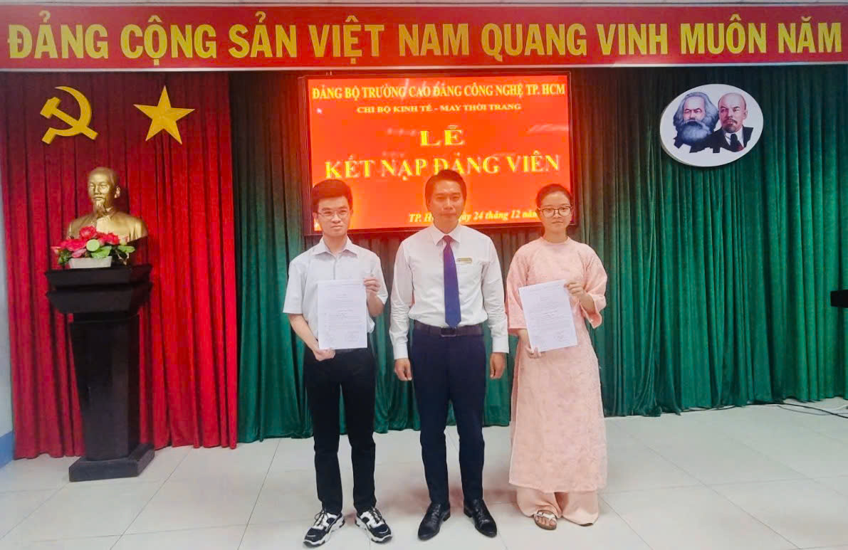 Thực hiện quyết định của Ban thường vụ Đảng uỷ Tập đoàn Dệt may Việt Nam, ngày 24 tháng 12 năm 2024, Chi bộ Kinh tế – May thời trang, trường Cao đẳng Công nghệ TP.HCM long trọng tổ chức Lễ kết nạp Đảng viên cho 2 quần chúng ưu tú là sinh viên khoa Kinh tế – Du lịch và khoa Công nghệ may – Thời trang.