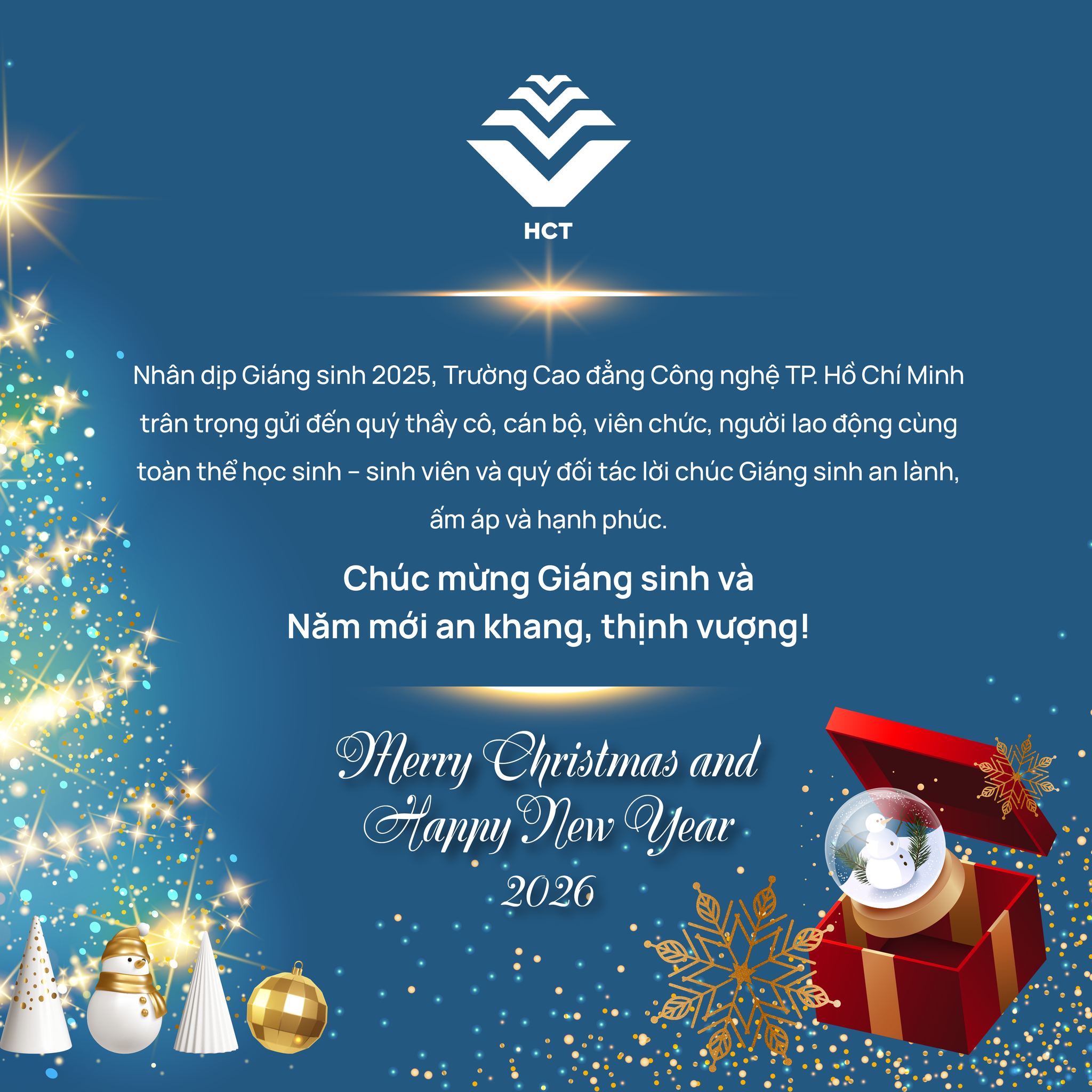 Nhân dịp Giáng sinh 2025, Trường Cao đẳng Công nghệ TP. Hồ Chí Minh trân trọng gửi đến quý thầy cô, cán bộ – viên chức, người lao động, toàn thể học sinh – sinh viên cùng quý đối tác lời chúc Giáng sinh an lành, ấm áp và tràn đầy hạnh phúc.
