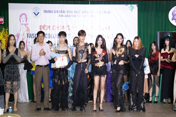 Thầy Nguyễn Ngọc Hiển – Hiệu trưởng nhà trường trao giải nhà thiết kế thời trang cho bộ sưu tập “Điểm Dừng”.