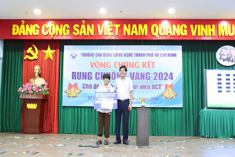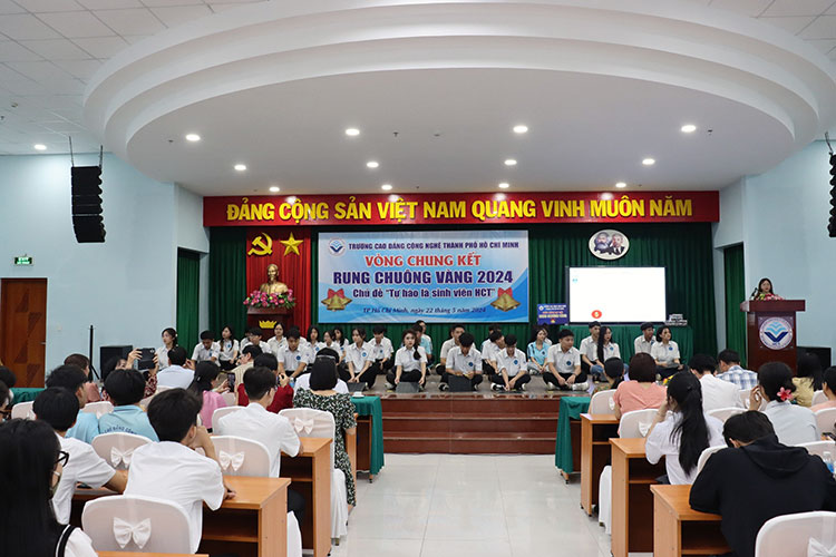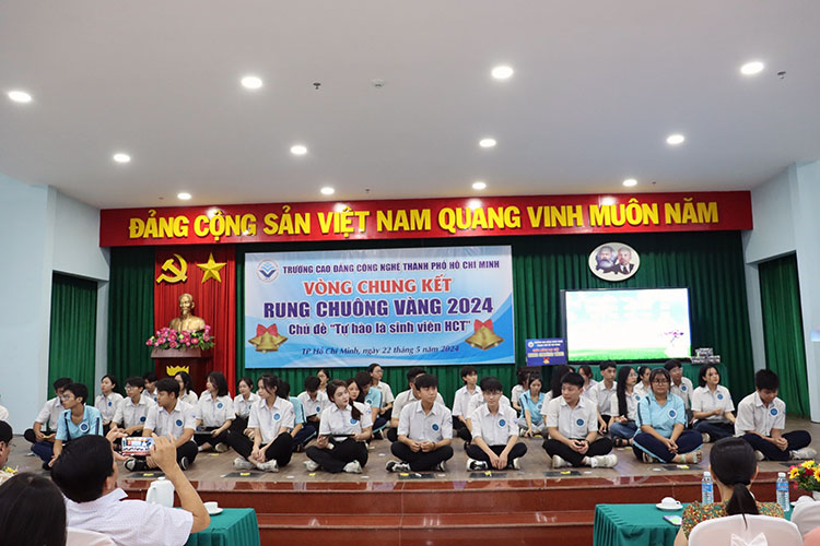 Sáng ngày 22/05/2024, tại Hội trường A, Trường Cao đẳng Công nghệ Thành phố Hồ Chí Minh đã diễn ra vòng chung kết Hội thi Rung chuông vàng năm 2024 với chủ đề “TỰ HÀO LÀ SINH VIÊN HCT”. Đến dự, có quý thầy cô trong Ban Giám hiệu; quý thầy cô là trưởng, phó các đơn vị, các giảng viên và gần 300 học sinh, sinh viên đại diện cho các lớp tham dự và cổ vũ cho các đội thi.