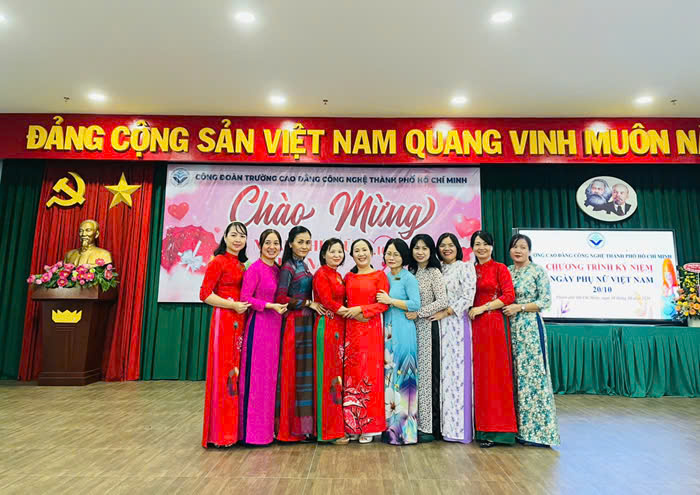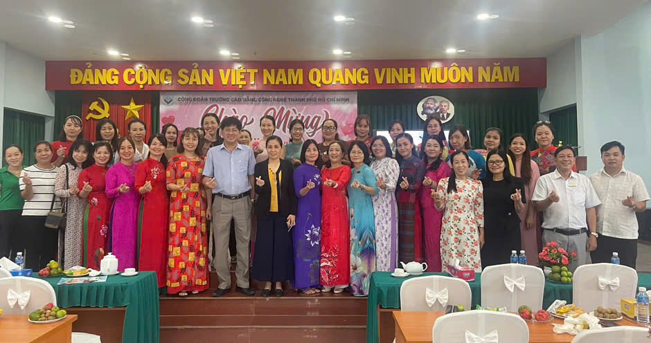 Hòa chung không khí phấn khởi, hân hoan và tự hào của Phụ nữ cả nước trong ngày Lễ kỷ niệm 94 năm ngày thành lập Hội Liên hiệp Phụ nữ Việt Nam (20/10/1930 – 20/10/2024). Sáng ngày 18/10/2024 tại hội trường A, Công đoàn trường Cao đẳng Công nghệ TP. Hồ Chí Minh tổ chức Kỷ niệm Ngày Phụ nữ Việt Nam trong không khí vui tươi, sôi nổi với nhiều tiết mục văn nghệ và chương trình đố vui trúng thưởng đã được quý thầy/ cô tham dự chương trình nhiệt tình tham gia, qua đó thắt chặt thêm tình đoàn kết, gắn bó giữa CBVC đang công tác tại Trường. Đến dự Kỷ niệm Ngày Phụ nữ Việt Nam 20/10 có Thầy Nguyễn Ngọc Hiển – Bí thư Đảng ủy – Hiệu trưởng Nhà trường, Cô Phan Thị Hải Vân – UVBCH Đảng ủy – Phó Hiệu trưởng Nhà trường, đồng chí Bùi Ngọc Bốn – Chủ tịch Công đoàn, cùng quý thầy, cô là cán bộ quản lý phòng, khoa, trung tâm và CBVC nữ.