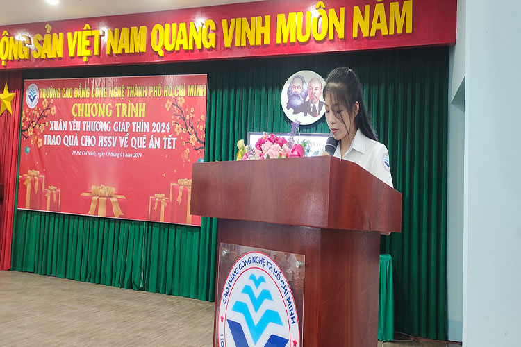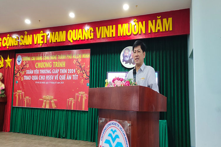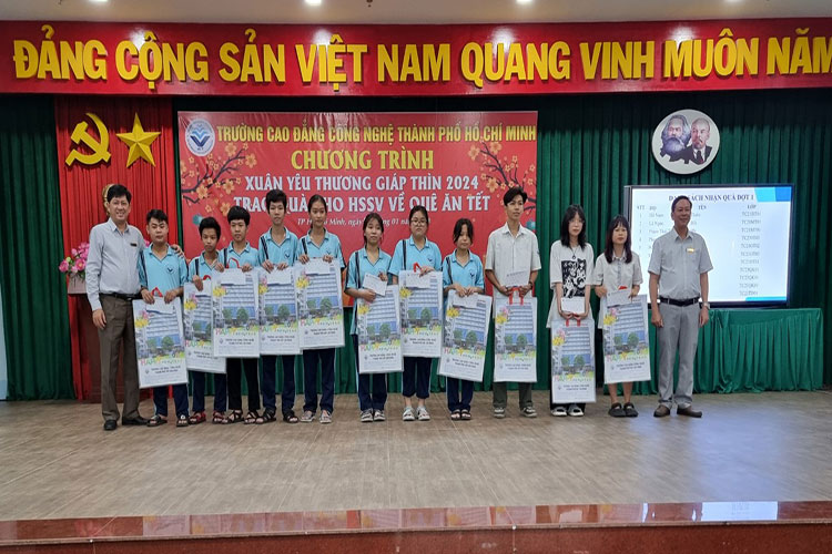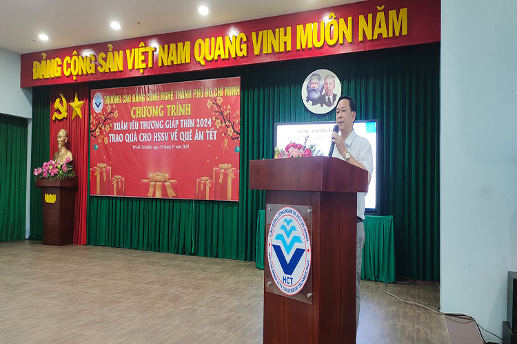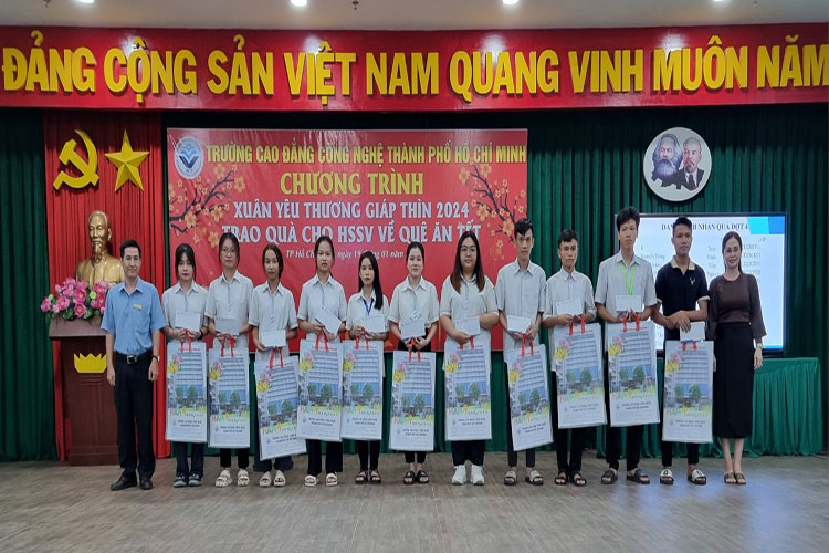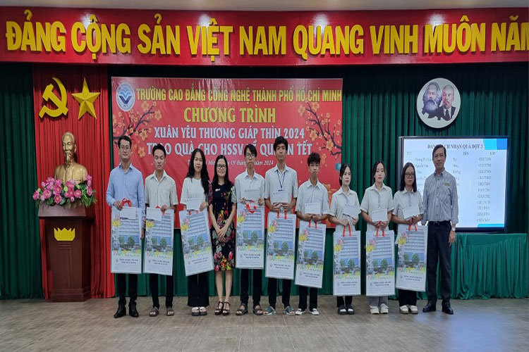 Được sự đồng ý của Đảng ủy, Ban Giám hiệu nhà trường, ngày 19/01/2024 Ban Chấp hành Công đoàn Trường Cao đẳng Công nghệ TP.HCM đã tổ chức chương trình “Xuân yêu thương Giáp Thìn 2024 trao quà cho HSSV về quê đón Tết”. Đến dự chương trình có Thầy Nguyễn Ngọc Hiển – Hiệu trưởng nhà trường; đồng chí Bùi Ngọc Bốn – Chủ tịch Công đoàn Trường cùng quý thầy, cô giáo là cán bộ chủ chốt, CVHT và đại diện các bạn HSSV.