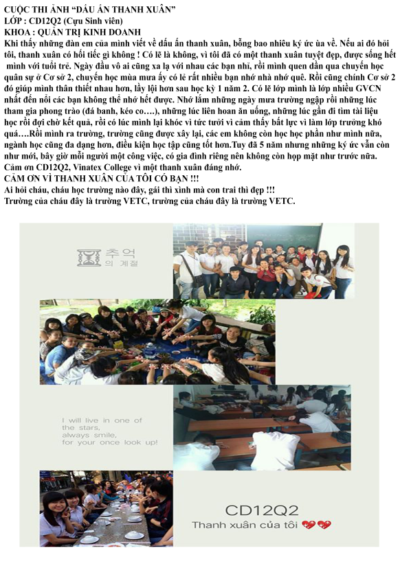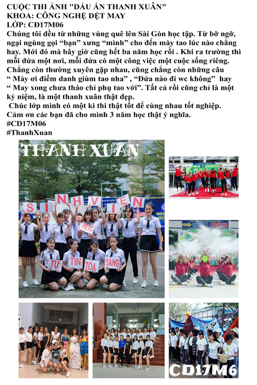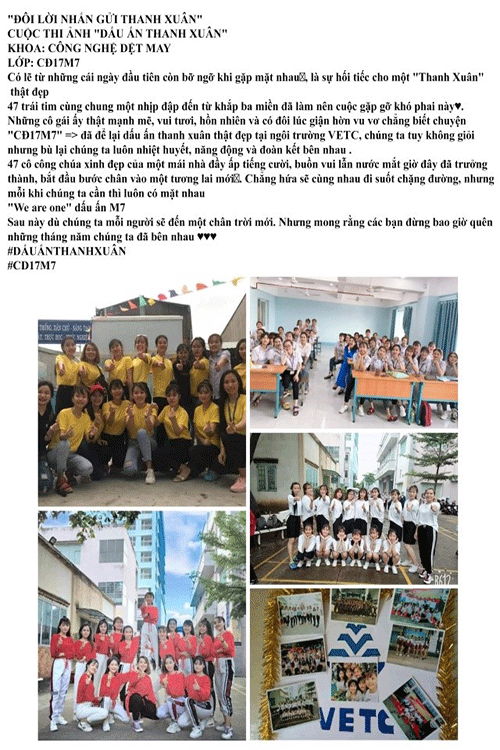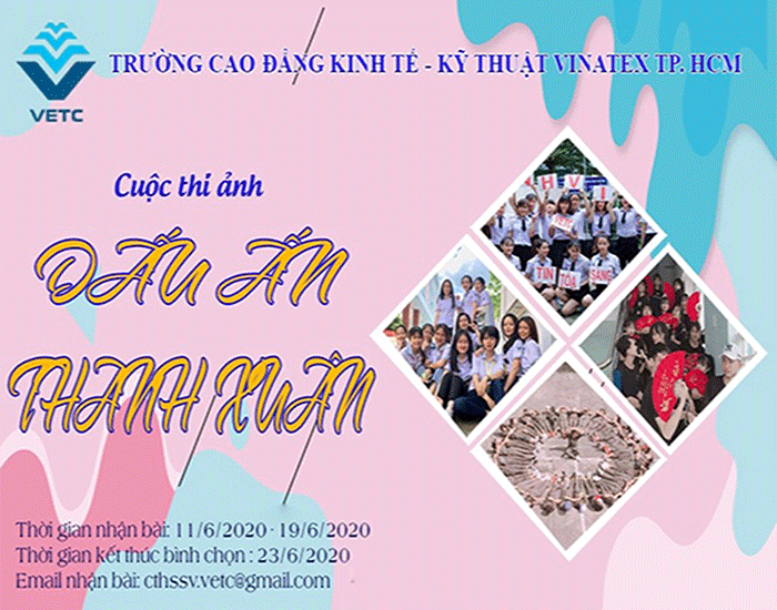 Nhằm tuyên tuyền và quảng bá rộng rãi hình ảnh của Trường đến toàn thể đoàn viên, thanh niên (ĐVTN) và học sinh, sinh viên (HSSV). Đồng thời tôn vinh những tình cảm đẹp, những khoảnh khắc đẹp của HSSV bên mái trường, thầy cô, bạn bè nhằm thể hiện tình yêu thương, sự gắn bó, truyền thống tôn sư trọng đạo từ đó góp phần giáo dục, nhắc nhở cho HSSV về giá trị nhân văn sâu sắc. Trường Cao đẳng Kinh tế – Kỹ thuật Vinatex Tp.HCM tổ chức cuộc thi ảnh “Dấu ấn Thanh xuân” năm 2020. Với hình thức thi trực tuyến, các bài thi được tổng kết điểm từ MXH thông qua lượt Like, Comment, Share.
