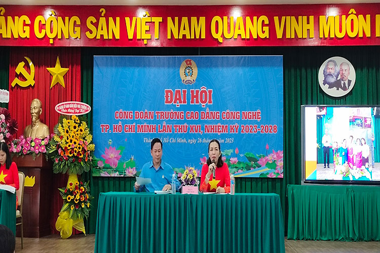 Phát biểu tại Đại hội, đồng chí Nguyễn Ngọc Hiển – Bí thư Đảng ủy, hiệu trưởng Nhà trường cho biết, công đoàn Trường Cao đẳng Công nghệ TP.HCM vừa trải qua một nhiệm kỳ khó khăn, với tình hình kinh tế, xã hội thế giới và Việt Nam đều diễn biến khó lường theo chiều hướng xấu. Đặc biệt, giai đoạn dịch bệnh Covid-19 với các đợt giãn cách liên tiếp gây ảnh hưởng rất lớn đến hoạt động giảng dạy và học tập. Trong bối cảnh đó, công đoàn Trường Cao đẳng Công nghệ TP.HCM đã phát huy tốt vai trò của mình, chăm lo tốt đời sống CB-GV-CNV trong trường, đảm bảo tốt các quyền lợi của đoàn viên công đoàn. Đồng chí Nguyễn Ngọc Hiển cũng nhấn mạnh, trong nhiệm kỳ tới, Công đoàn Trường Cao đẳng Công nghệ TP.HCM cần tích cực đổi mới phương thức hoạt động, xây dựng các chương trình hành động, phong trào thi đua có định hướng. Chăm lo tốt hơn đến đời sống vật chất và tinh thần của đoàn viên công đoàn. BCH Công đoàn cần chủ động tham mưu cho Đảng ủy, Ban giám hiệu nhà trường các chế độ, chính sách phù hợp với tình hình và động viên kịp thời cho đoàn viên công đoàn.