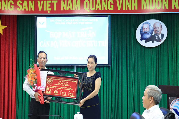 Đồng chí Hồ Ngọc Tiến – Bí thư Đảng ủy, hiệu trưởng nhà trường tặng hoa chúc mừng Ban Chấp hành nhiệm kỳ 2022-2027