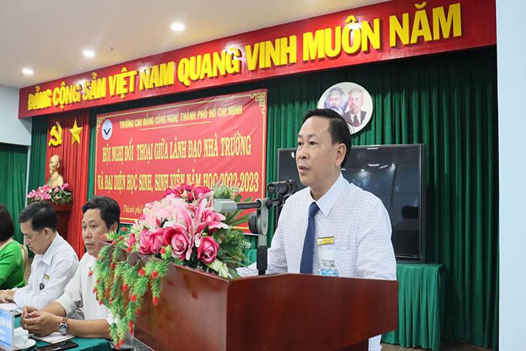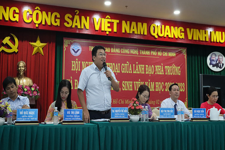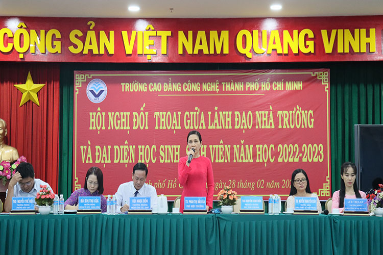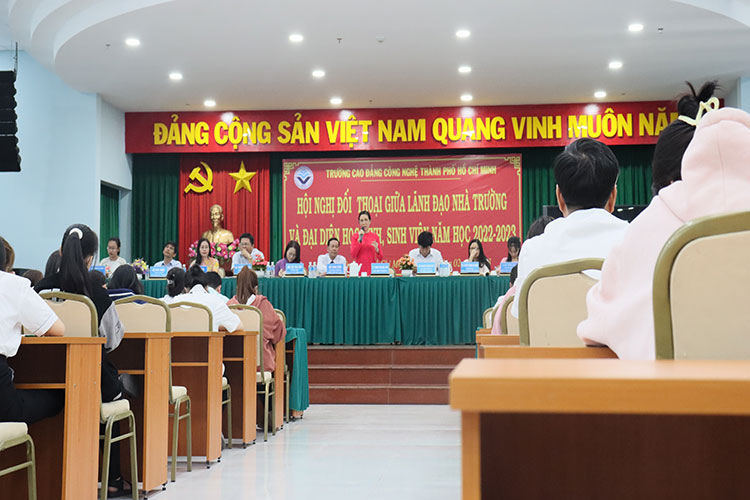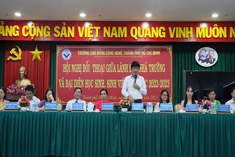 Sáng ngày 28/02/2023, Trường Cao đẳng Công nghệ TP. Hồ Chí Minh tổ chức Hội nghị đối thoại giữa Ban Giám hiệu, lãnh đạo các phòng, khoa của trường và đại diện HSSV. Tham dự Hội nghị có ThS.Nguyễn Ngọc Hiển – Phó Hiệu trưởng phụ trách trường, TS.Phan Thị Hải Vân – phó hiệu trưởng, cùng quý thầy, cô là trưởng, phó các đơn vị và gần 200 HSSV đại diện các lớp tham dự.