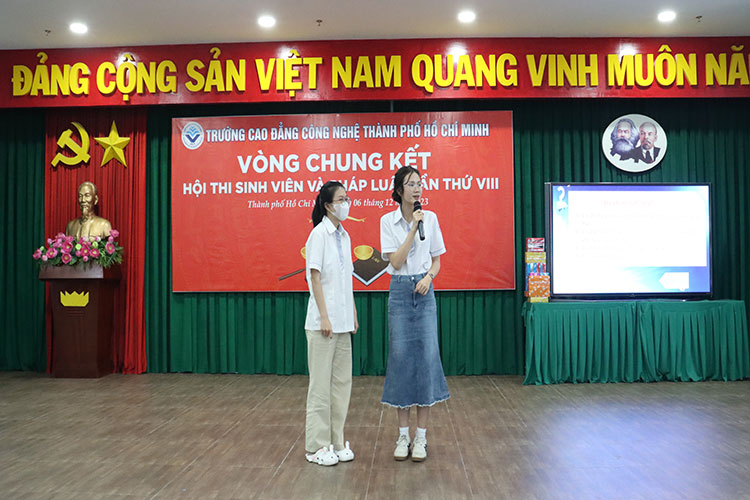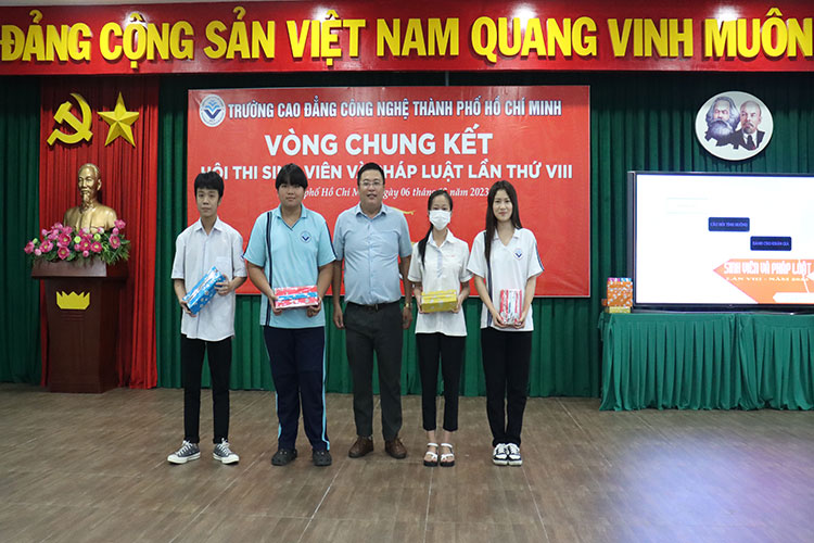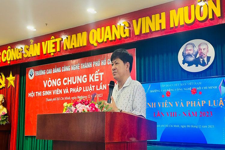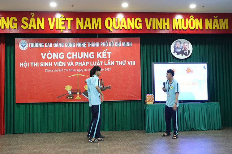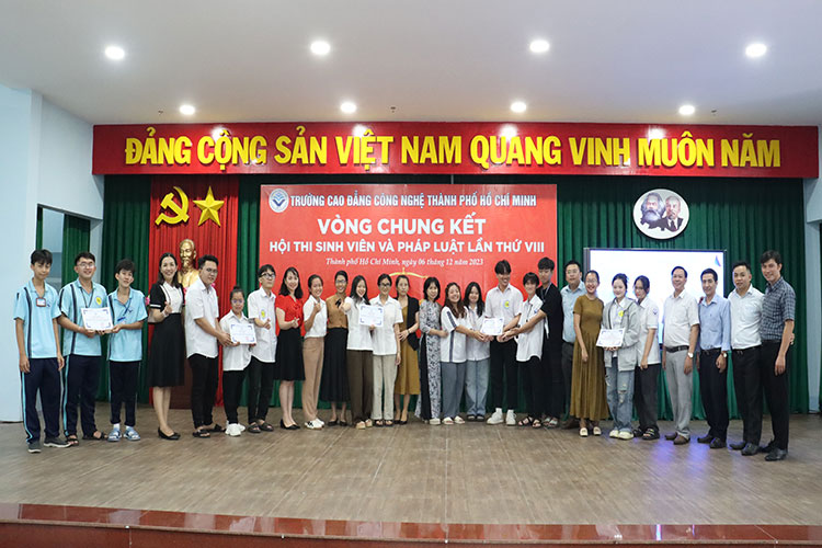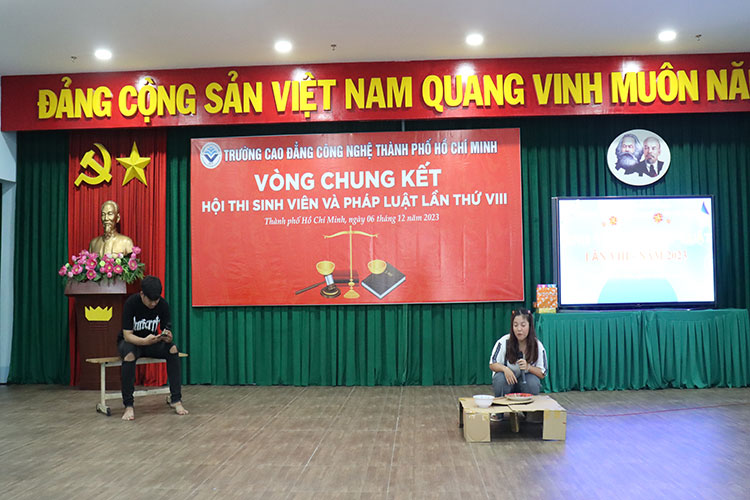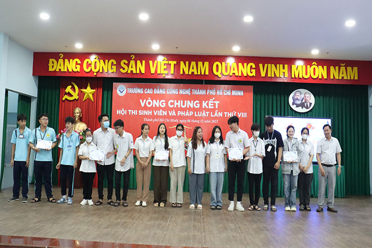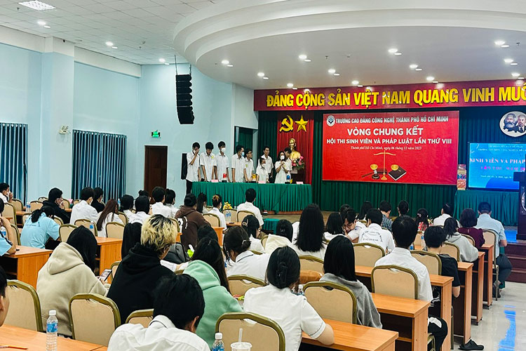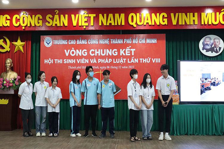 Sáng ngày 05/12/2023 tại hội trường A, Trường Cao đẳng Công nghệ TP.HCM tổ chức vòng chung kết hội thi “SINH VIÊN VÀ PHÁP LUẬT LẦN VIII– NĂM 2023” Đến dự hội thi có Thầy Nguyễn Ngọc Hiển – Hiệu trưởng nhà trường cùng quý thầy, cô là cán bộ quản lý các phòng, khoa, cố vấn học tập, các đội dự thi cùng hơn 200 sinh viên đại diện cho các khoa tham dự. Với mong muốn tạo sân chơi lành mạnh, bổ ích cho sinh viên sau những giờ học căng thẳng, tạo điều kiện đẩy mạnh phong trào thi đua sôi nổi trong HSSV, tuyên truyền về pháp luật để HSSV hiểu biết về luật trong các hoạt động của bản thân và xã hội. Đồng thời cung cấp kiến thức giúp HSSV rèn luyện kỹ năng, tư duy, xử lý tình huống…; tạo điều kiện để HSSV trong nhà trường giao lưu, học hỏi, bổ sung thêm các kiến thức mới về pháp luật, chia sẻ những kinh nghiệm trong học tập cũng như trong cuộc sống. Hội thi “Sinh viên và pháp luật” lần VIII năm 2023 đã tổ chức thực hiện với sự tham gia 100% sinh viên dự thi theo các đơn vị khoa và đã lựa chọn ra 09 đội có thành tích tốt nhất để tham gia vòng chung kết cấp trường.