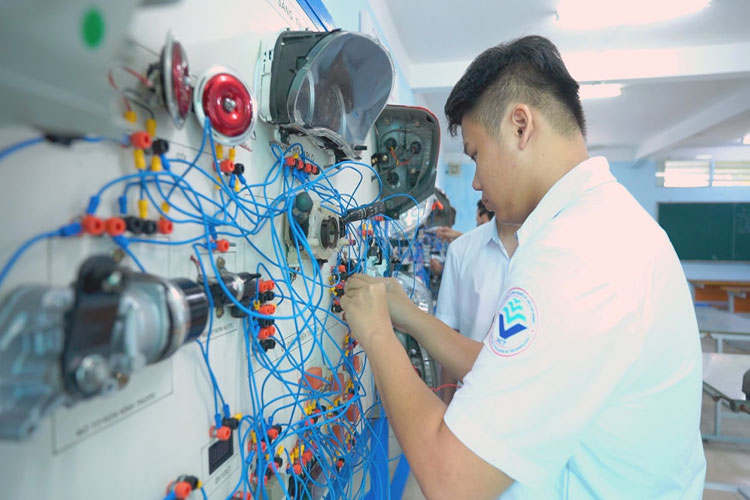 Sinh viên ngành Công nghệ kỹ thuật ô tô học thực hành tại xưởng