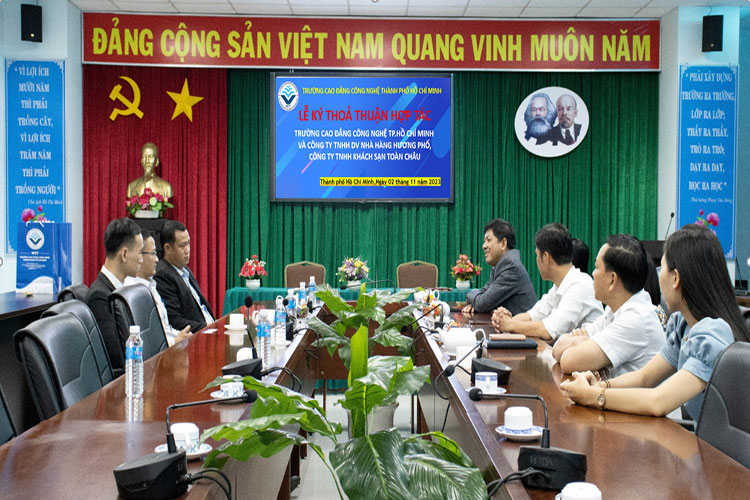 Chiều ngày 02/11/2023, Trường Cao đẳng Công nghệ TP.HCM (HCT) tiếp Công ty TNHH – DV Nhà hàng Hương Phố và Công ty TNHH Khách sạn Toàn Châu. Tham dự trong buổi làm việc, Về phía Công ty TNHH – DV Nhà hàng Hương Phố đại diện ông Nguyễn Văn Nam – Phó Giám đốc thường trực, Về phía Công ty TNHH Khách sạn Toàn Châu đại diện Ông Lê Minh Phát – Tổng Quản lí The Luxe Hotel – Saigon, The Luxe Hotel – Châu Đốc. Về phía Trường Cao đẳng Công nghệ TP.HCM có Thầy Nguyễn Ngọc Hiển – Hiệu trưởng nhà trường; Cô Phan Thị Hải Vân – Phó hiệu trưởng và Quý Thầy, Cô đại diện Phòng Đào tạo quản lý HSSV, Khoa Kinh tế – Du lịch.