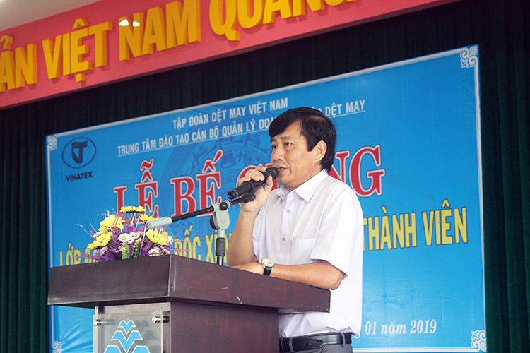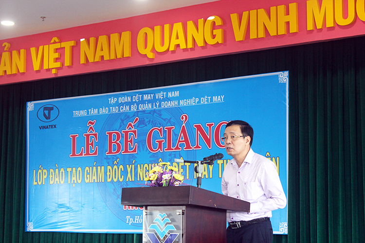 TS. Hồ Ngọc Tiến – Hiệu trưởng Trường Cao đẳng Kinh tế – Kỹ thuật Vinatex TP. Hồ Chí Minh đại diện cho cơ sở đào tạo phát biểu cảm ơn sự tận tâm giảng dạy của các thầy, cô giáo, sự phục vụ chu đáo của cán bộ, nhân viên nhà trường và nổ lực của tất cả học viên trong quá trình học tập đã góp phần cho việc tổ chức đào tạo thành công của khóa học. Bên cạnh đó, nhắc nhở các học viên từ những kiến thức, kỹ năng được trang bị trong quá trình học tập, tiếp tục nghiên cứu, vận dụng vào thực tế doanh nghiệp của mình sau khi trở về công tác.