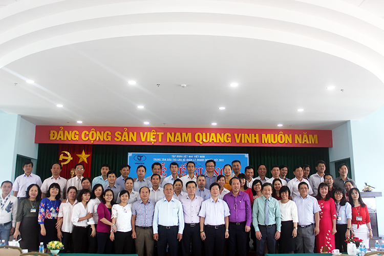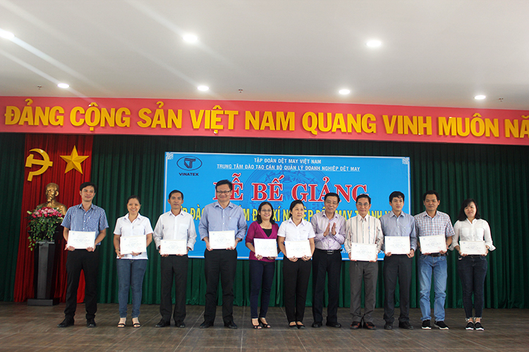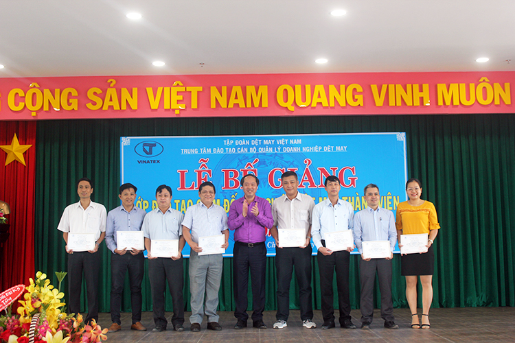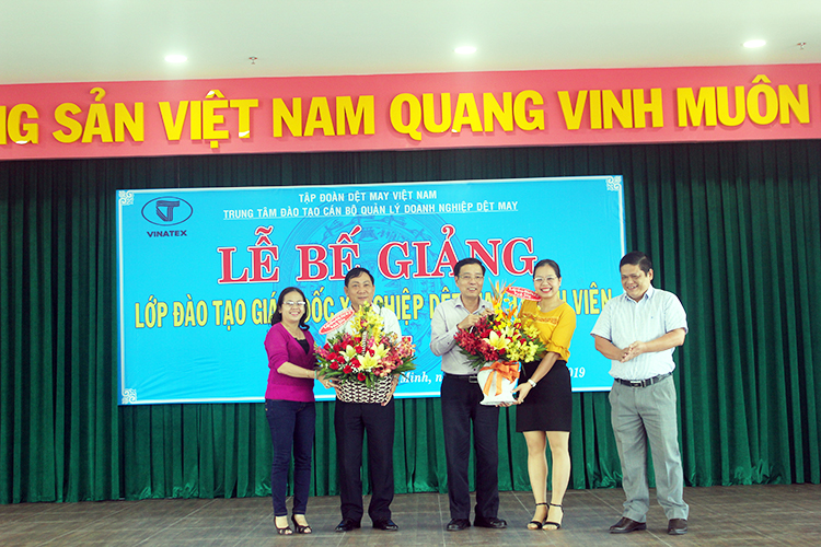 – Ông Lê Nho Thướng – Phó Bí thư Đảng ủy Tập đoàn Dệt may Việt Nam, Chủ tịch Công đoàn Dệt may Việt Nam; Ông Nguyễn Khánh Sơn – Giám đốc điều hành Tập đoàn Dệt may Việt Nam kiêm Giám đốc Trung tâm đào tạo cán bộ quản lý doanh nghiệp Dệt May; TS. Hoàng Xuân Hiệp – Hiệu trưởng Trường Đại học Dệt may Hà Nội kiêm Phó Giám đốc Trung tâm Đào tạo cán bộ quản lý doanh nghiệp Dệt may và đại diện các doanh nghiệp sợi, dệt, may có học viên tham gia khóa học.