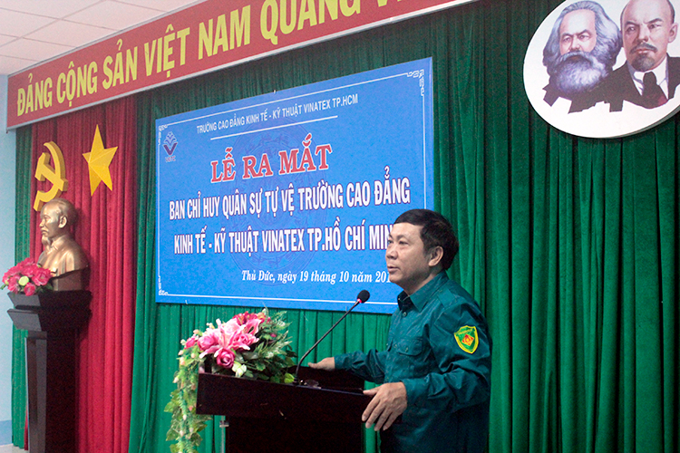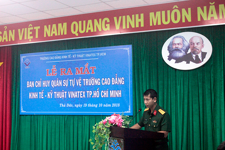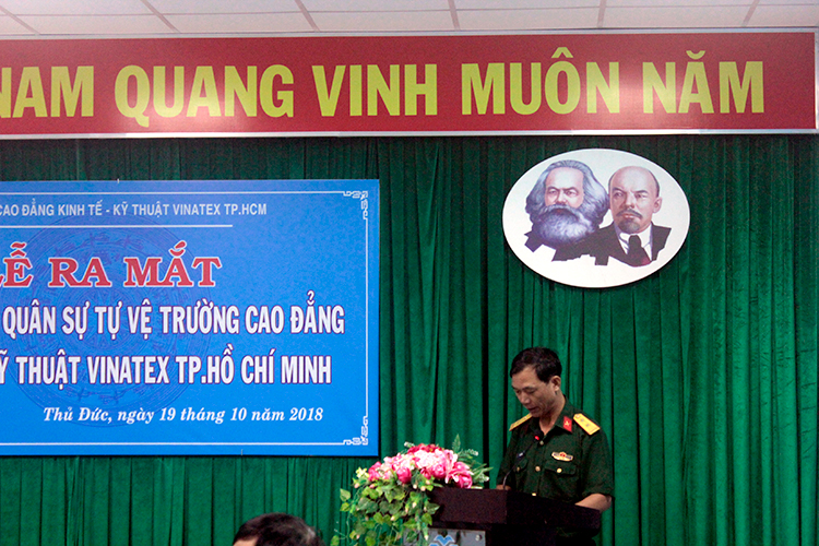 Phát biểu tại buổi lễ, Trung tá Nguyễn Nhâm, Phó Chỉ huy trưởng, tham mưu trưởng BCHQS quận Thủ Đức đã đánh giá cao trách nhiệm của trường Cao đẳng Kinh tế – Kỹ thuật Vinatex TP. Hồ Chí Minh trong việc thành lập và ra mắt BCHQS và Trung đội tự vệ nhà trường; đồng chí đã nêu ra những âm mưu “diễn biến hòa bình” gần đây của các thế lực thù địch, đồng thời, lưu ý BCHQS và Trung đội tự vệ nhà trường ngoài việc thực hiện nhiệm vụ chính trị chuyên môn còn phải tổ chức tham mưu cho Đảng ủy, Ban giám hiệu nhà trường, cơ quan quân sự cấp trên xây dựng kế hoạch an ninh quốc phòng tại đơn vị, tích cực tuyên truyền vận động cán bộ, viên chức, người lao động của trường phối hợp với các đơn vị lực lượng vũ trang khác trên địa bàn tham gia xây dựng nền quốc phòng toàn dân, giữ gìn an ninh, chính trị, trật tự, an toàn xã hội, bảo vệ Đảng, chính quyền, bảo vệ tính mạng, tài sản của nhân dân, tài sản của Nhà nước tại nhà trường và địa phương.