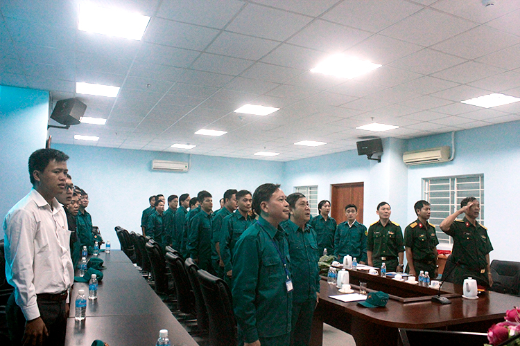 Cán bộ, chiến sĩ Trung đội tự vệ trường chụp ảnh lưu niệm