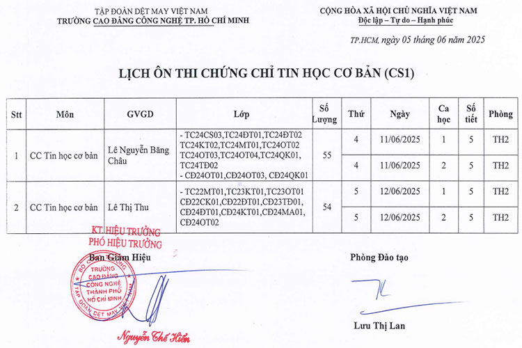 Lịch ôn thi chứng chỉ Tin học tại Trụ sở chính (Ngày ôn 11; 12/06/2025)