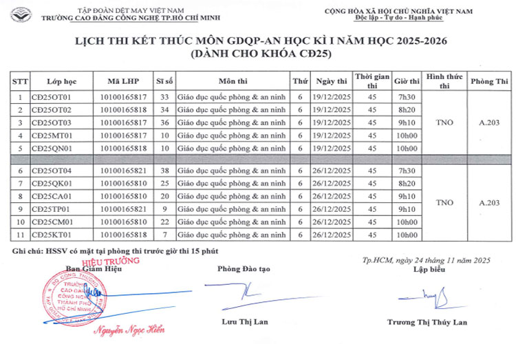 Lịch thi kết thúc môn học Giáo dục Quốc phòng – An ninh, học kỳ 1, năm học 2025 – 2026 ( Khoá CĐ25)