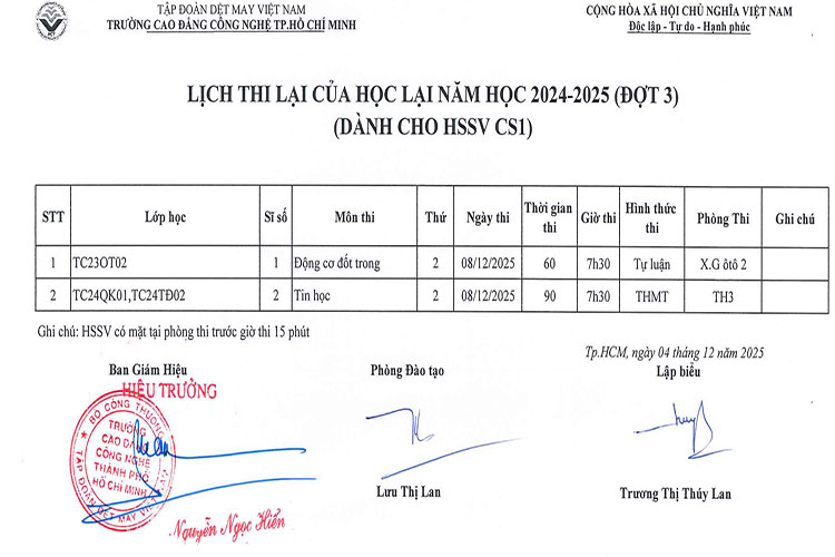 Lịch thi lại của học lại năm học 2014 -2025 (Tại trụ sở chính)