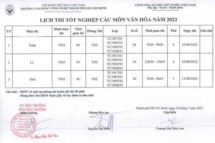 Lịch thi tốt nghiệp các môn văn hoá năm 2022