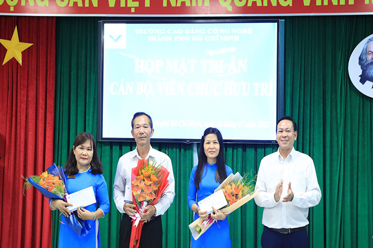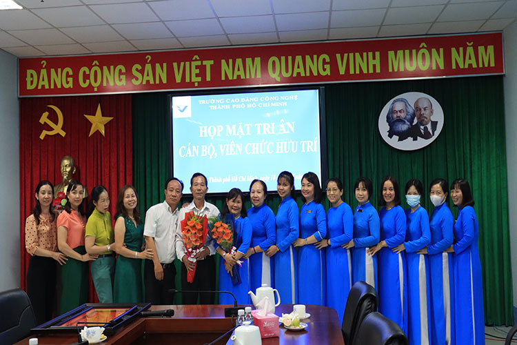 Chiều ngày 18/7/2022, trường Cao đẳng Công nghệ TP. Hồ Chí Minh đã tổ chức buổi họp mặt cán bộ, viên chức nghỉ hưu trong năm 2022. Chương trình được thực hiện nhằm tri ân sự đóng góp, cống hiến của quý thầy, cô cho sự nghiệp giáo dục của Nhà trường trong suốt thời gian vừa qua.