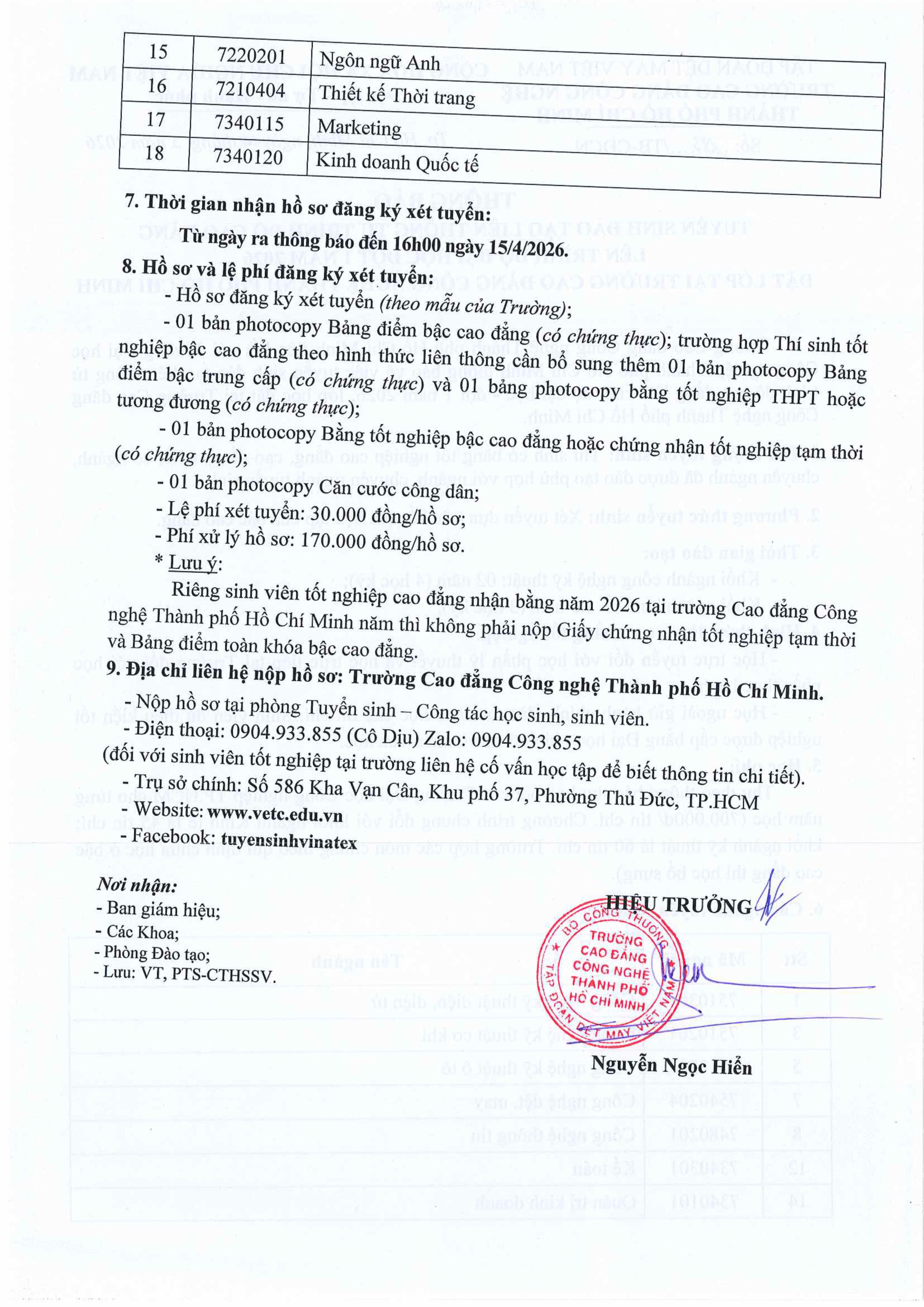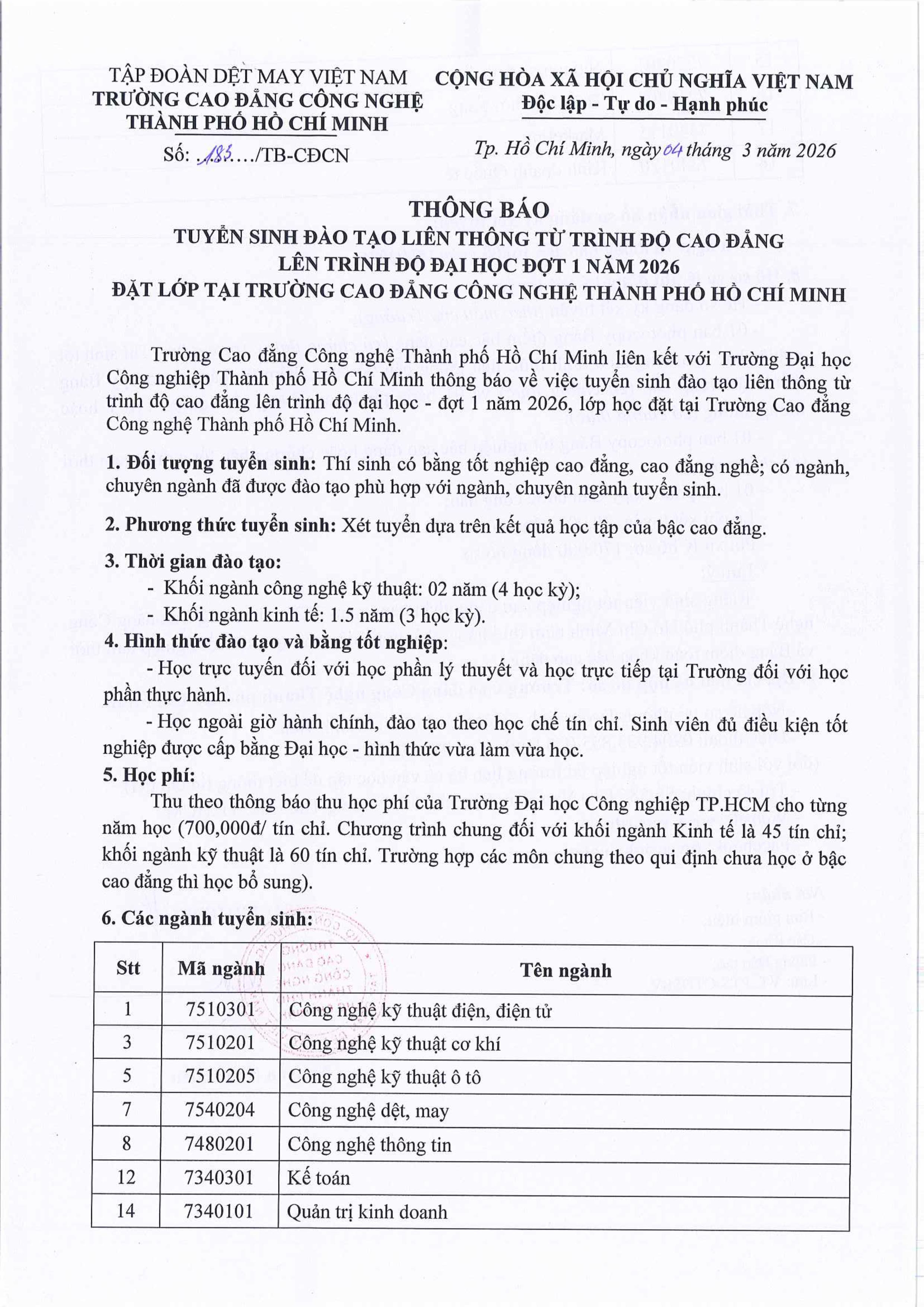Thông báo liên thông từ Trình độ Cao đẳng lên Đại học năm 2026 Đợt 1