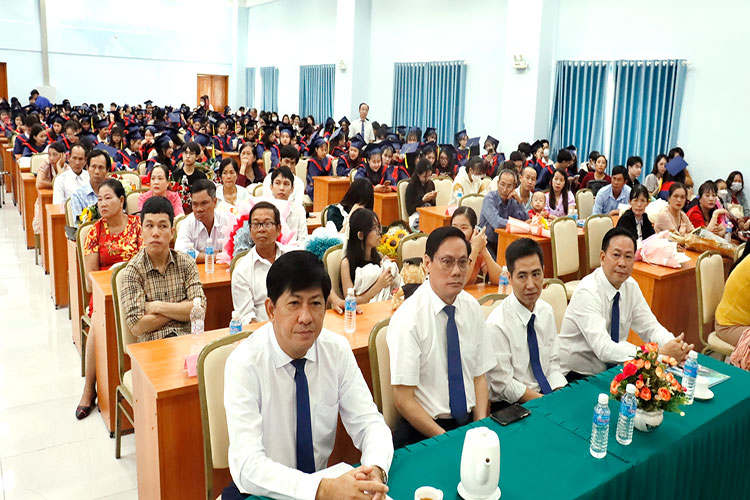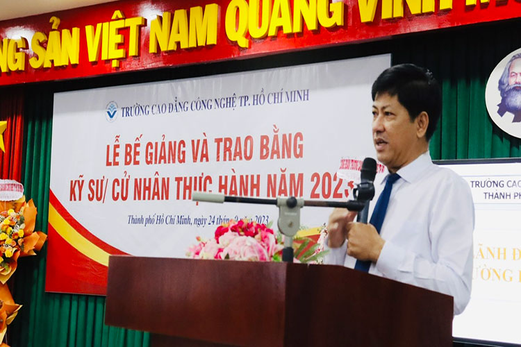 Phát biểu tại buổi lễ, Thầy Nguyễn Ngọc Hiển – Hiệu trưởng nhà trường chúc mừng đến sinh viên Khoá học 2020 – 2023 đã hoàn thành tốt chương trình học tập của khoá học và được công nhận tốt nghiệp danh hiệu kỹ sư/cử nhân thực hành năm 2023, Thầy cũng biểu dương toàn thể sinh viên đã vượt mọi thách thức trong suốt thời gian qua, cảm ơn quý phụ huynh vì sự đồng hành và hỗ trợ vô điều kiện để các em có được thành quả hôm nay. Thầy Nguyễn Ngọc Hiển mong các em hãy phấn đấu vì gia đình, vì bản thân và vì tương lai để chuẩn bị cho tháng ngày làm việc độc lập, cống hiến và thành công. Sau thời gian dài học tập, hãy trân trọng và biết ơn những điều đã qua, khoảng thời gian đẹp nhất của thời sinh viên thầy và trò cùng nhau phấn đấu để góp phần vào việc quảng bá hình ảnh của Trường đến các doanh nghiệp và xã hội.