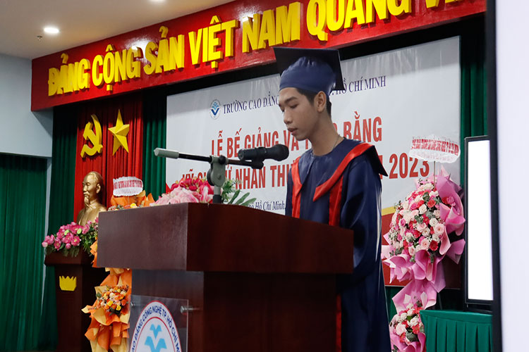 Thay mặt cho Tân Kỹ sư/Cử nhân, sinh viên Nguyễn Văn Quốc lớp CĐ20TT01, khoa Công nghệ may-Thời trang đã bày tỏ những suy nghĩ trong niềm hạnh phúc trong buổi lễ tốt nghiệp. Chúng em biết ơn cha mẹ đã sinh thành và nuôi dưỡng, chúng em biết ơn thầy cô đã truyền dạy kiến thức, tạo mọi điều kiện cho chúng em học tập và hoạt động phong trào để rèn luyện kỹ năng, ứng xử, mối quan hệ xã hội và hơn hết thầy cô còn là chỗ dựa tinh thần, là con thuyền chở những ước mơ, niềm tin vào một tương lai tươi sáng. Thay mặt cho toàn thể HSSV tốt nghiệp, em xin hứa sẽ luôn cố gắng trên bước đường sự nghiệp để trở thành những người có ích cho xã hội, xứng đáng với công ơn của thầy cô và cha mẹ.