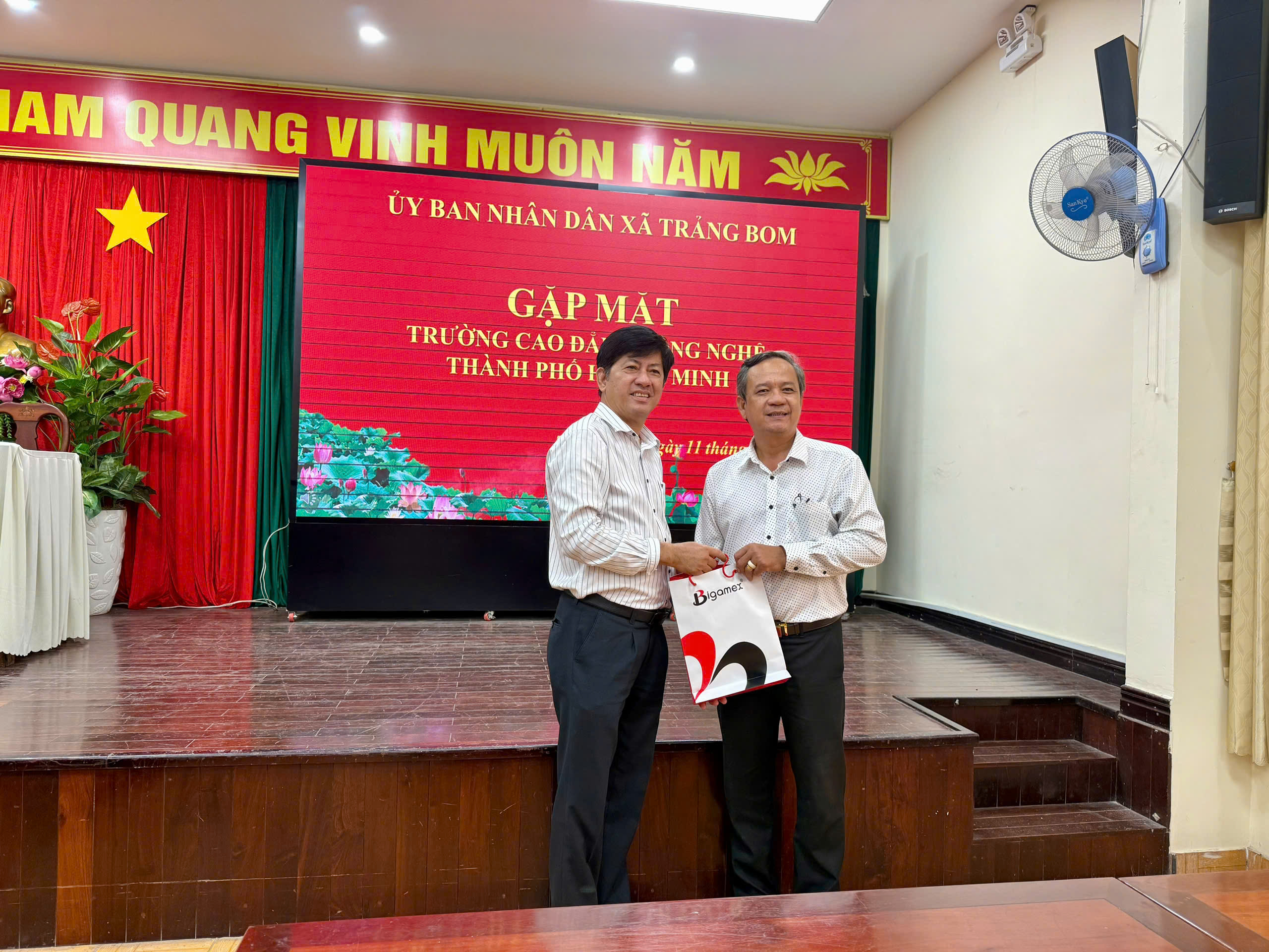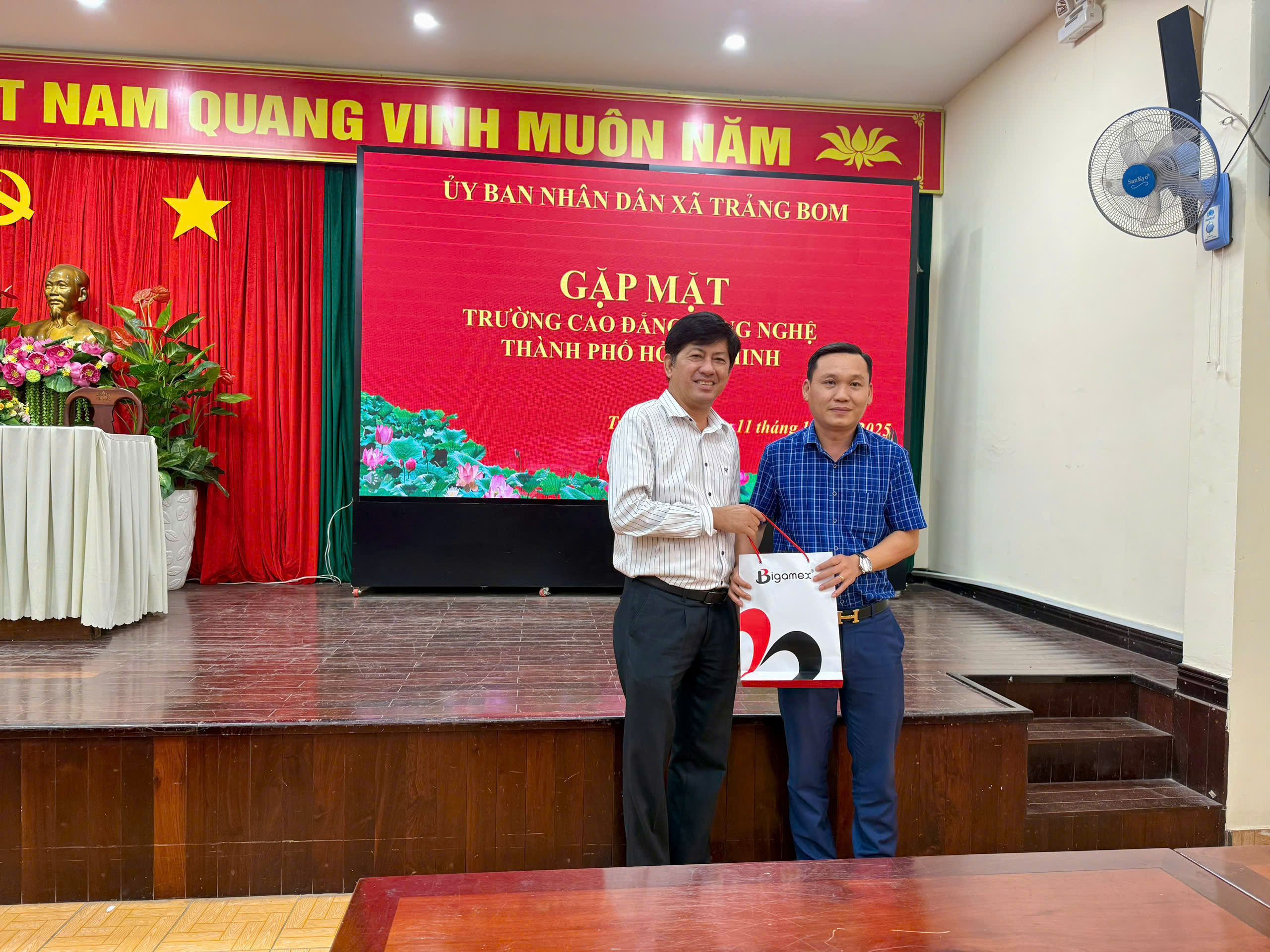 Đại diện Trường Cao đẳng Công nghệ Thành phố Hồ Chí Minh tặng quà lưu niệm cho lãnh đạo UBND xã Trảng Bom và Bảo hiểm xã hội cơ sở Trảng Bom tại buổi làm việc.