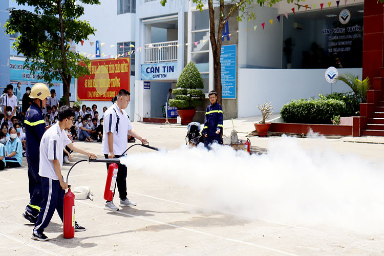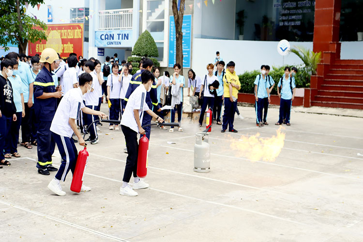 Với sự hướng dẫn của Thiếu tá Hồ Thanh Hiền cùng các cán bộ thuộc Đội phòng cháy chữa cháy TP. Thủ Đức, buổi tập huấn đã diễn ra trong không khí sôi nổi, hào hứng, tích cực học tập. HSSV nhà trường đã được trang bị kiến thức và thực hành kỹ năng sử dụng hệ thống vòi phun áp lực, quy trình xử lý công tác chữa cháy và thực hiện giả định tình hướng cháy và chữa cháy.
