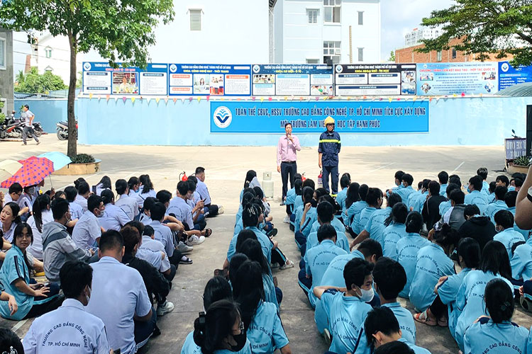Nhằm nâng cao nhận thức, vai trò và trách nhiệm của học sinh, sinh viên đối với công tác phòng cháy chữa cháy, sáng ngày 27/09/2023, Trường Cao đẳng Công nghệ TP Hồ Chí Minh phối hợp với Công an PCCC Thành phố Thủ Đức tổ chức buổi tập huấn phòng cháy chữa cháy cho HSSV các lớp trong trường.