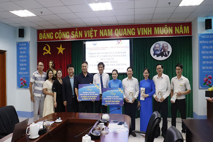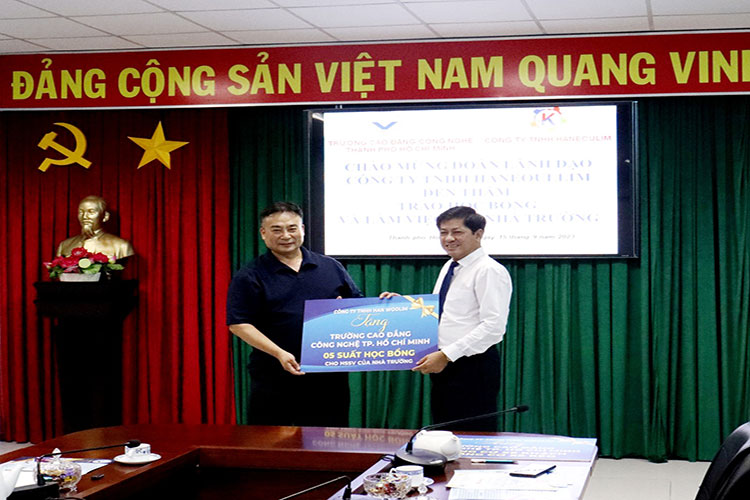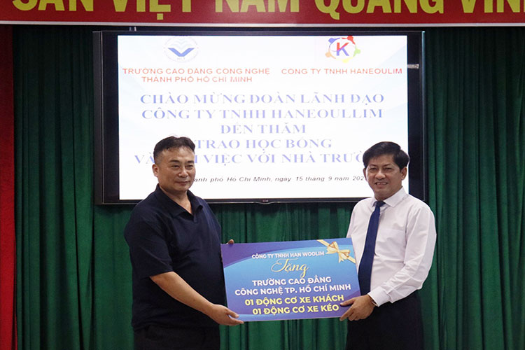 Chiều ngày 15/09, Trường Cao đẳng Công nghệ TP.HCM (HCT) tiếp đoàn lãnh đạo Công ty Haneoullim Hàn Quốc đến thăm, làm việc và trao học bổng, thiết bị học tập cho ngành công nghệ kỹ thuật ô tô. Tham dự trong buổi làm việc, về phía Trường Cao đẳng Công nghệ TP.HCM có Thầy Nguyễn Ngọc Hiển – Hiệu trưởng; Cô Phan Thị Hải Vân – Phó hiệu trưởng và Thầy Cô lãnh đạo các phòng khoa. Về phía Công ty Haneoullim Hàn Quốc có Ông Lee Jong Gil Tổng giám đốc công ty cùng đại diện các phòng ban.