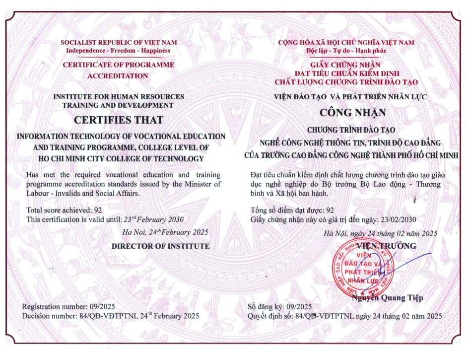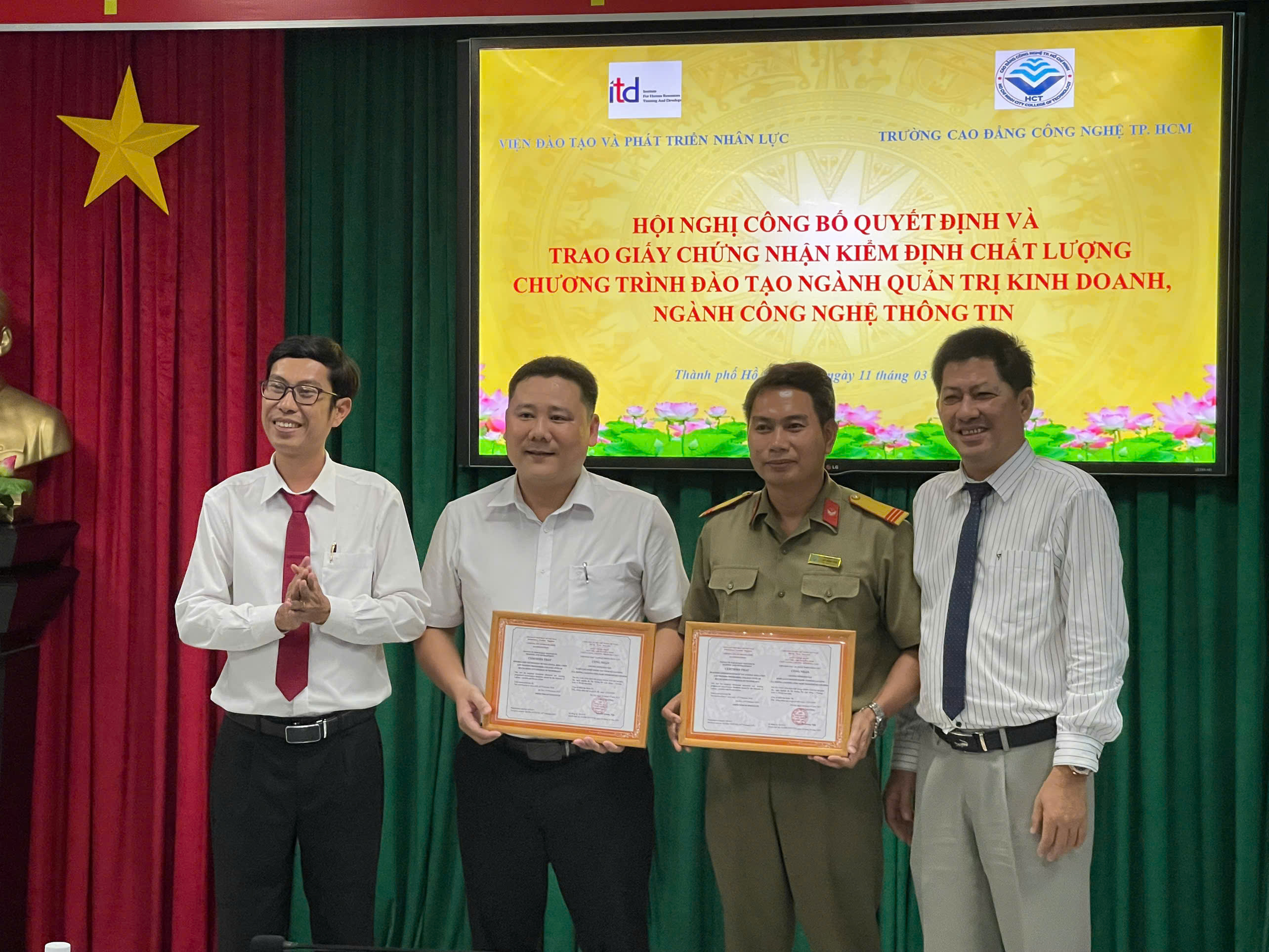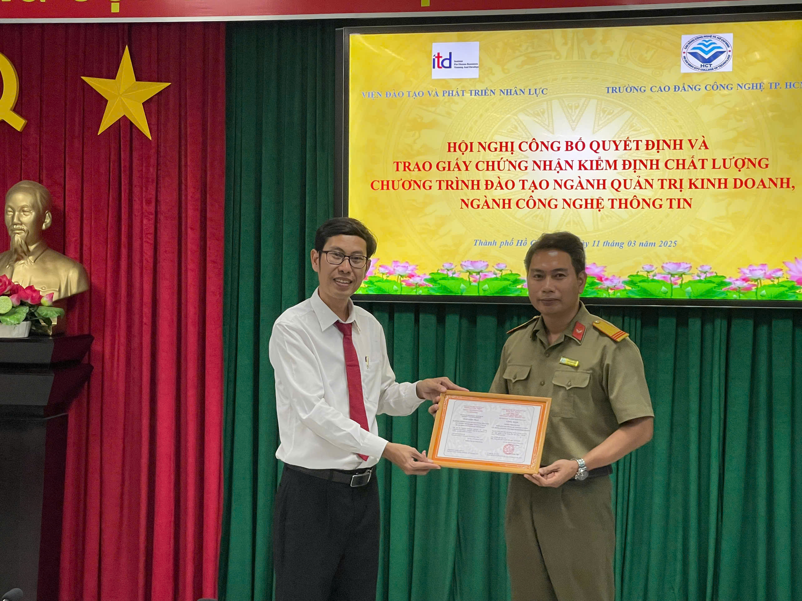 Ngày 11/03/2025, Viện Đào tạo và Phát triển nhân lực đã phối hợp với Trường Cao đẳng Công nghệ TP.HCM tổ chức Lễ công bố Quyết định và trao chứng nhận kiểm định chất lượng 2 chương trình đào tạo cho Trường.
