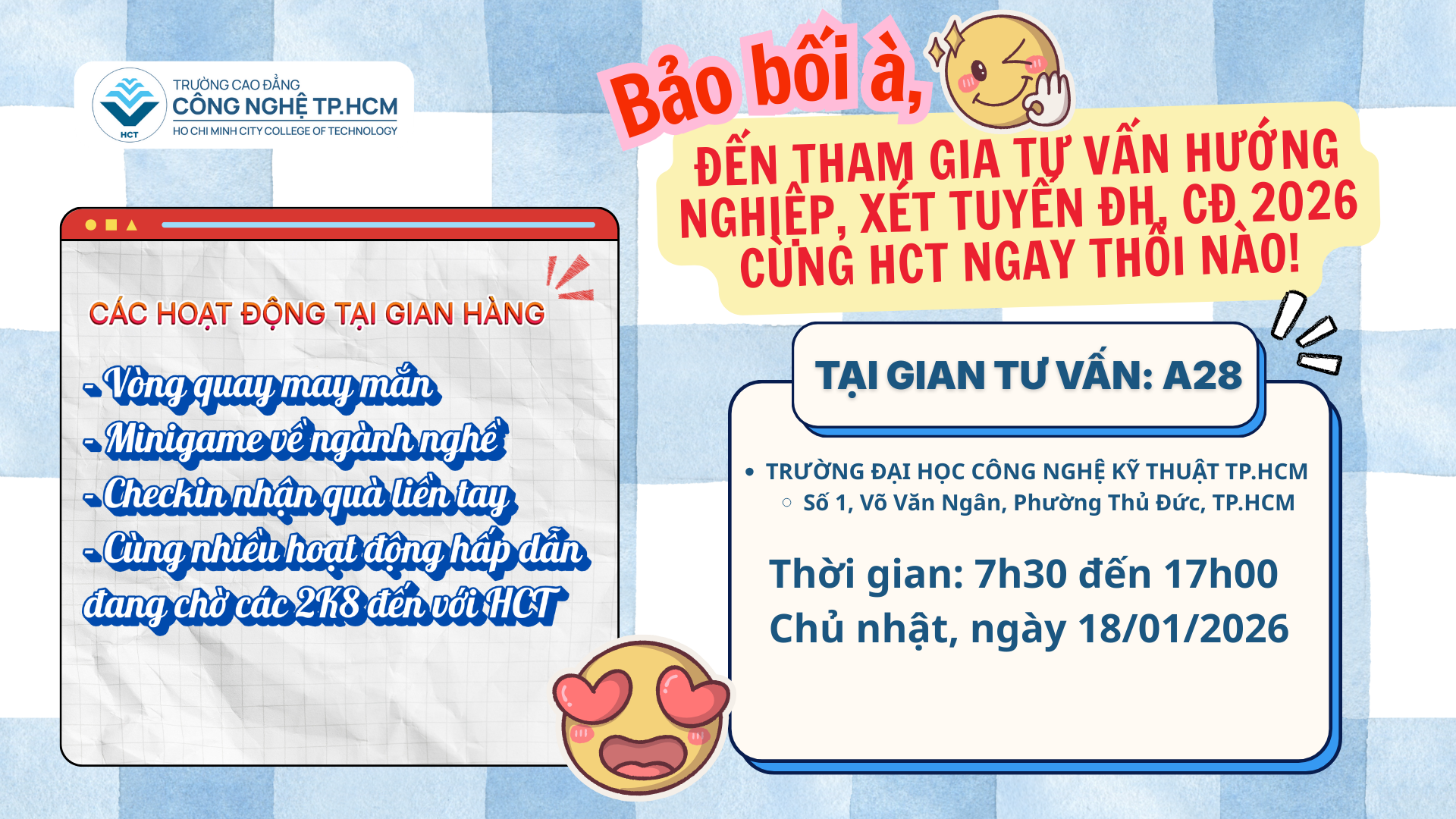 Trường Cao đẳng Công nghệ TP.HCM (HCT) tham gia Ngày hội tư vấn hướng nghiệp – xét tuyển ĐH, CĐ 2026 tại Trường ĐH Công nghệ Kỹ thuật TP.HCM, tư vấn trực tiếp về ngành học, lộ trình đào tạo và cơ hội việc làm cho học sinh.