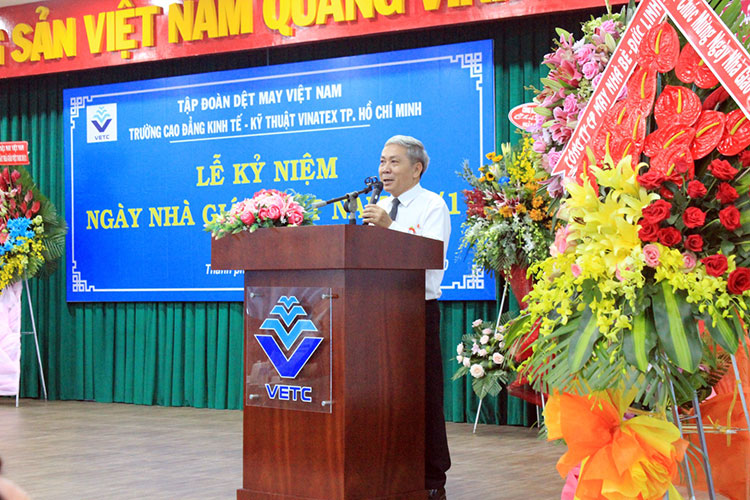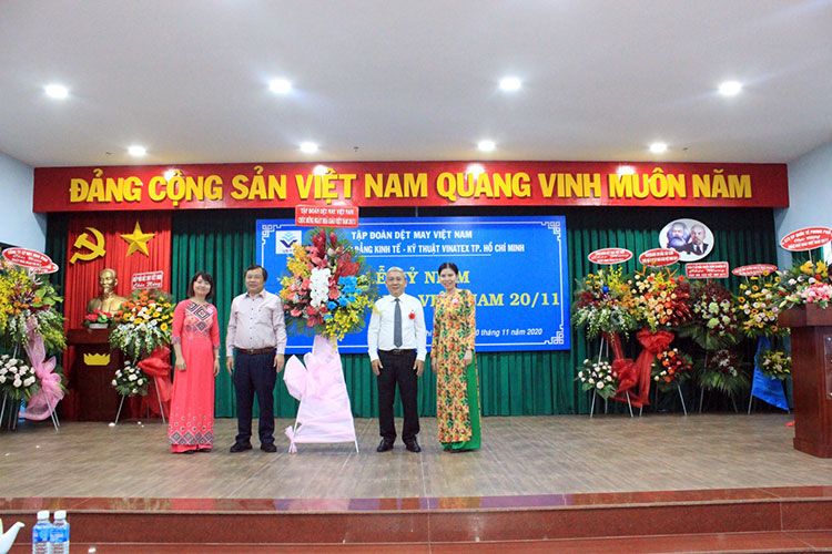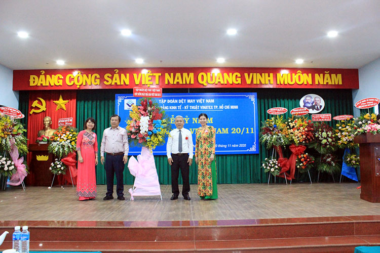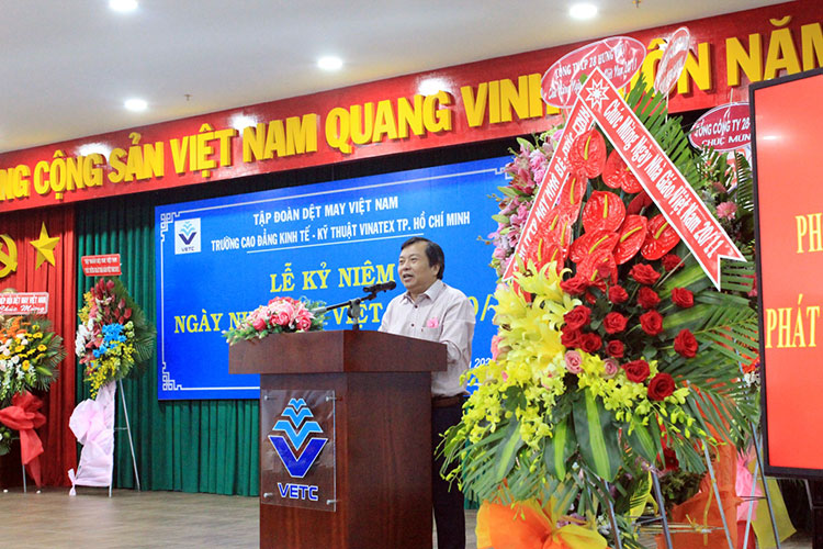 Thay mặt lãnh đạo Tập đoàn Dệt May Việt Nam, ông Lê Trung Hải – Phó Tổng Giám đốc Tập đoàn Dệt May Việt Nam đã tặng hoa, chúc mừng Ban Giám hiệu Nhà trường cùng các thầy, cô giáo. Ông Lê Trung Hải cho biết, lãnh đạo Tập đoàn đánh giá cao những cống hiến của quý thầy, cô đã góp phần đáng kể vào những thành tích của Tập đoàn trong thời gian qua. Đồng thời ông cũng mong muốn trong thời gian tới nhà trường tiếp tục nỗ lực vượt qua khó khăn, xây dựng nhà trường ngày càng phát triển. Bên cạnh đó, các thầy cô ngoài việc truyền nghề, truyền chữ cho học sinh, sinh viên phải làm sao truyền được nghị lực, truyền lửa nhiệt tình, đam mê cho các em để đào tạo ra một thế hệ học sinh, sinh viên không chỉ có tay nghề vững vàng, chuyên môn sâu mà còn có cả những nhiệt huyết, đam mê cống hiến cho xã hội, cho đất nước, đặc biệt là cho ngành Dệt May Việt Nam.