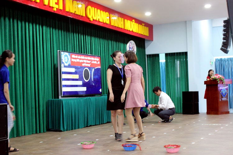 Giảng viên khoa Thiết kế thời trang thực hiện trò chơi chuyền bóng để cứu trợ thí sinh trở lại dự thi