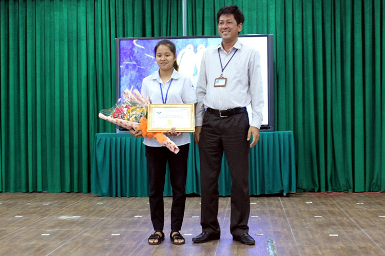 ThS. Nguyễn Ngọc Hiển – Phó hiệu trưởng nhà trường trao hoa và phần thưởng cho thí sinh Nguyễn Thị Loan – Người dành chiến thắng và rung chuông vàng trong hội thi